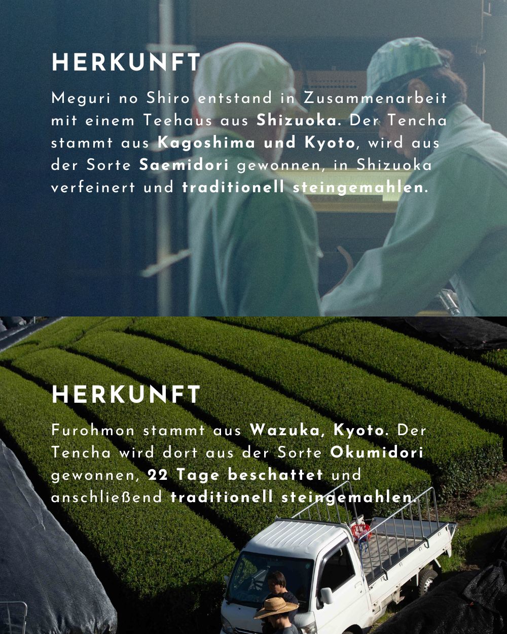 Furohmon stammt aus Wazuka, Kyoto. Der Tencha wird dort aus der Sorte Okumidori gewonnen, 22 Tage beschattet und anschließend traditionell steingemahlen.